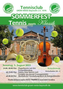 Sommerfest 2025 ‚Tennis meets Kassik‘ am Sonntag, den 3. August 2025 findet unser jährliches Sommerfest ‚Tennis mees Klassik‘ auf unseren Vereinsgelände statt. ab 18.00 bis 20.00 Uhr ein Doppelturnier mit